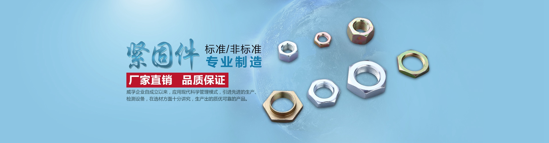 About us瑞安市威孚標準件有限公司企業創辦于1994年,是一家專業生產及加工標準件、高強度緊固件的廠家。主要的產品有防松螺母、鎖緊螺母、六角螺母、法蘭螺母、半圓鍵、尼龍防松螺母、自鎖螺母等。常見的其他附件有:螺絲、螺釘、墊圈、彈簧、墊片、連接件、彈墊、高強度螺栓。防松螺母的表面采用鍍鋅工藝,緊固功能強大,方便拆卸,固定好了就不會松動。我們的緊固件擁有高強度的連接方法,緊固的結構合理。標準件,采用新型的工藝及不銹鋼的材質,標準的規格,類型很多,非常實用。我們的防松螺母、鎖緊螺母等產品支持定制,適用于:裝修、機械等生活及工作上、產品不僅質量可靠,我們還提供了售前售后的服務,為您解決相關緊固件產品問題。